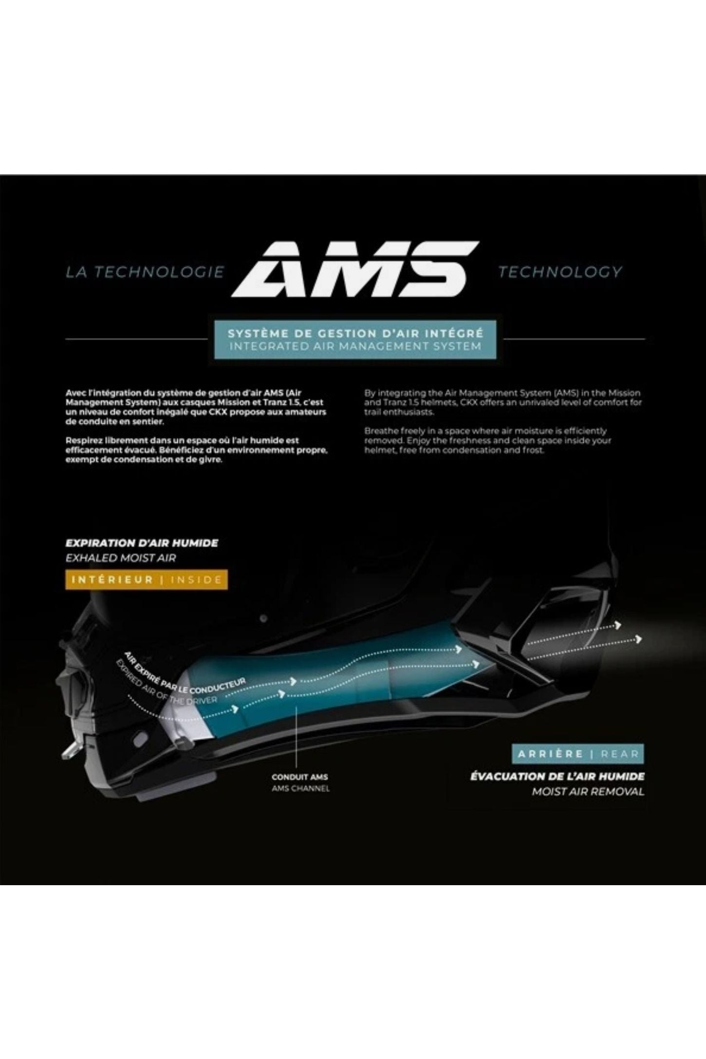Experience a unique helmet that redefines trail riding. Lightweight, insulated and aerodynamic, the Mission is designed to let you enjoy longer rides and at full speed without fear of extreme cold. Efficient in reducing the risk of fogging, the helmet introduces AMS, an integrated air management system. A CKX exclusive, AMS technology (patent pending) allows you to enjoy a clean environment, free from condensation and fogging by wicking away moist air to the outside. Maintain full visibility while riding and when stopping, take advantage of a wide opening by lifting the oversized visor. In one simple movement and without removing the helmet, you can drink, eat or converse with your trail-riding buddies!
